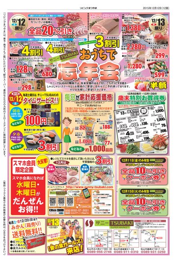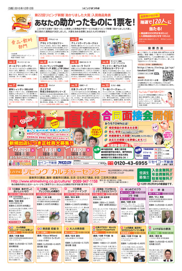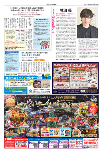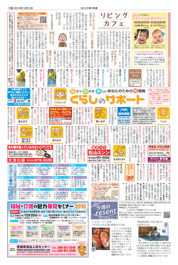 2015年もあと少し。 年末年始には、 家族の 頑張りを振り返りつつ、 来年の目標や夢も語 りたいものですね。 リビングまつやま年末年 始号でも、 ファミ リーに役立つ紙面で家族を 応援します。 その前に、 まずは、 読者のみなさ まにアンケート。 豪華クリスマスプレゼント を用意しています!ぜひ応募して ! 1 家族でごはん ★同居の家族がみんなでごはんを食べる頻度は ? 1.毎日毎食 2.1日1回 3.週に3回〜5回 4.週に1、 2回 5.ほと んど ない ★外食にでかけるのはどんなと き ?